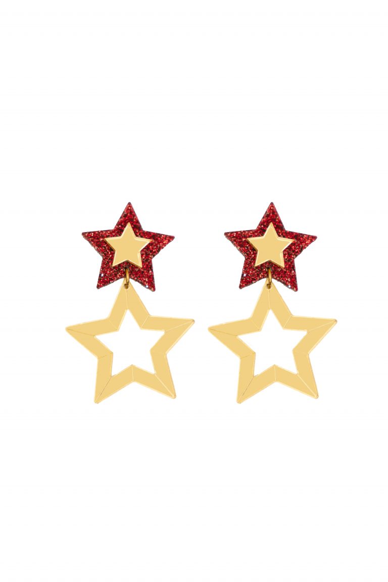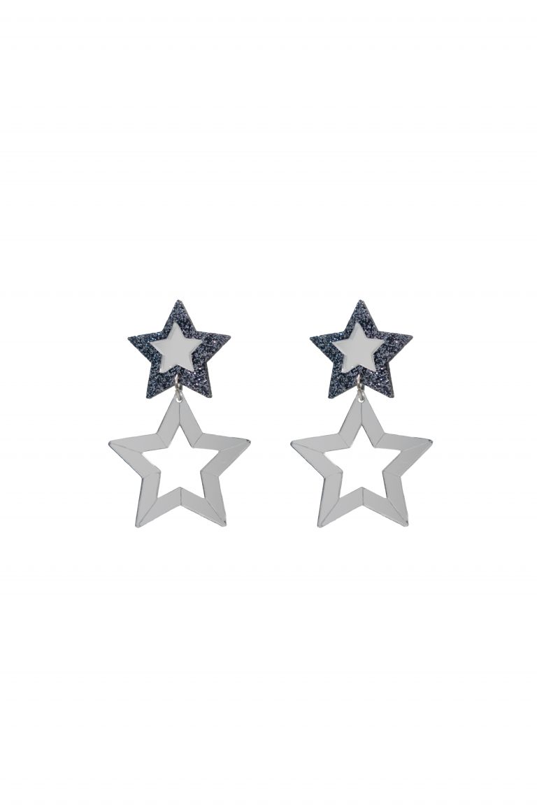 - 20,00€Pendientes Doble Estrella. Están realizados con metacrilato efecto purpurina y efecto espejo. El perno o ‘palito’ es de acero inoxidable. Mide: Pendiente al completo Doble Estrella – 6,4 cm. Estrella parte de arriba – 2,5cm.
