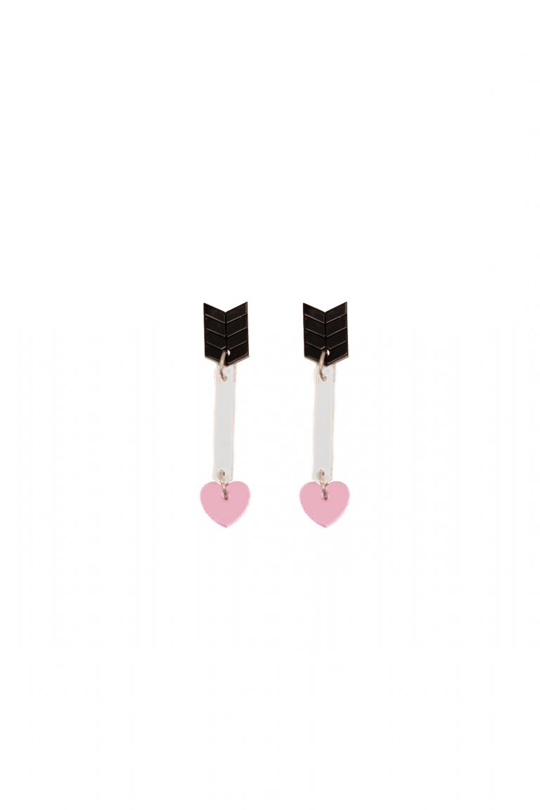 - 15,00€Pendientes flecha de cupido. Están realizados con metacrilato efecto mate y efecto espejo. El perno o ‘palito’ es de acero inoxidable.