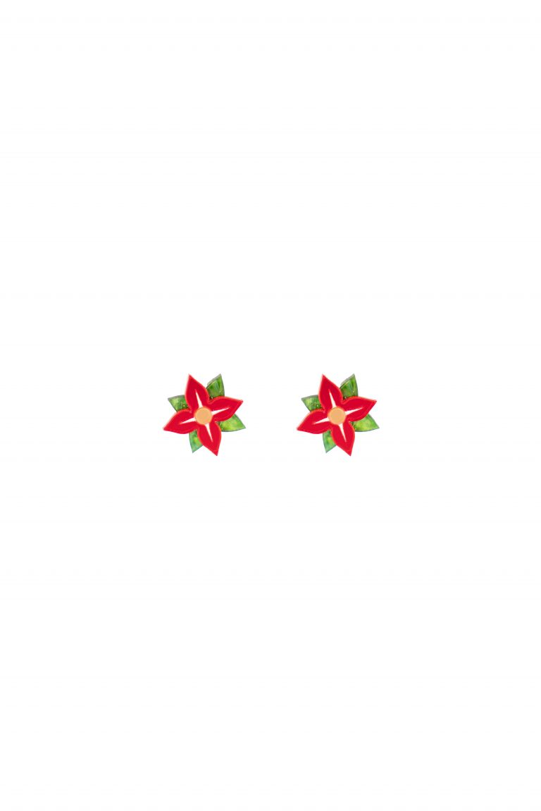 - 12,00€Pendientes Flor de Pascua. Están realizados con metacrilato efecto espejo y efecto marmolado. El perno o ‘palito’ es de acero inoxidable. Mide: Pendiente al completo Flor de Pascua – 1,7cm.