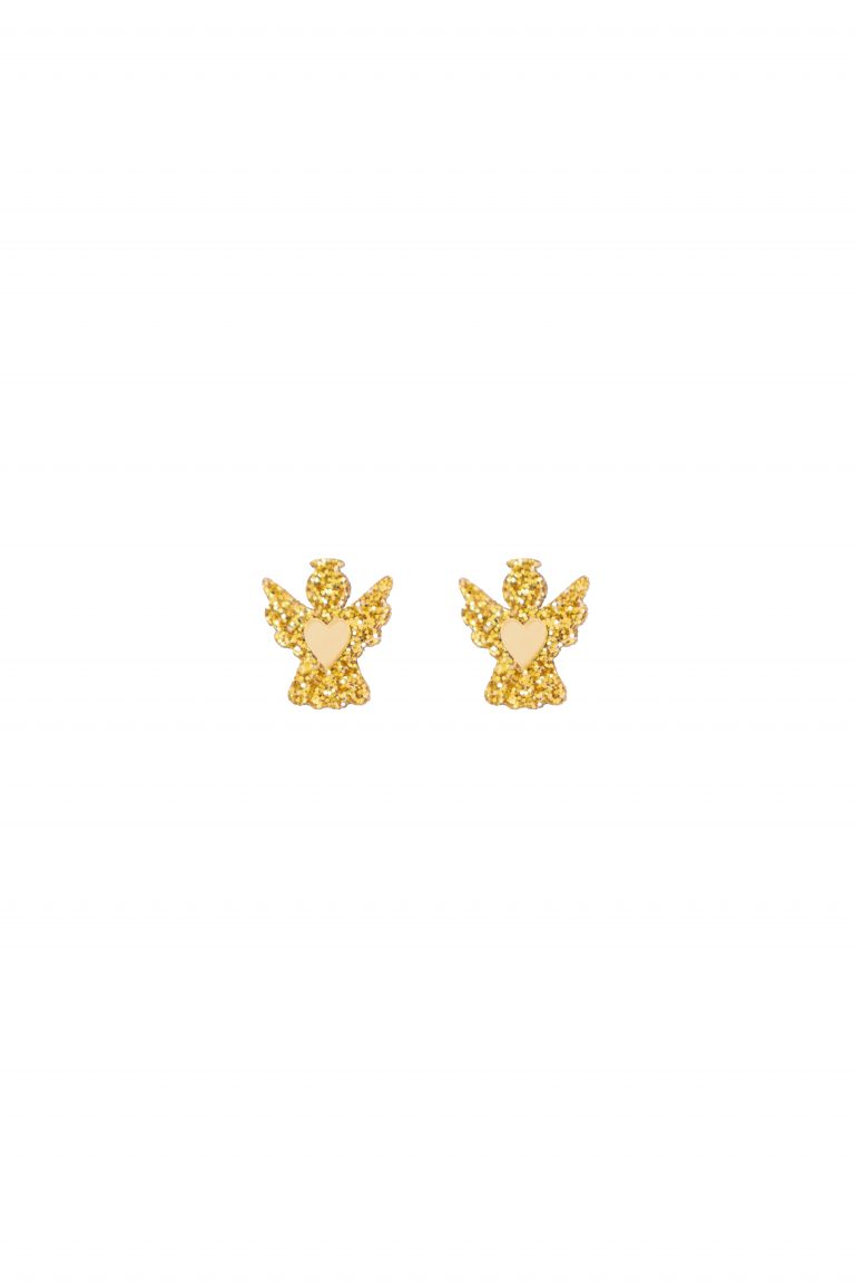 - 7,00€Pendientes Angelito. Están realizados con metacrilato efecto espejo y efecto purpurina. El perno o ‘palito’ es de acero inoxidable. Mide: Pendiente al completo Angelito – 1,8cm.