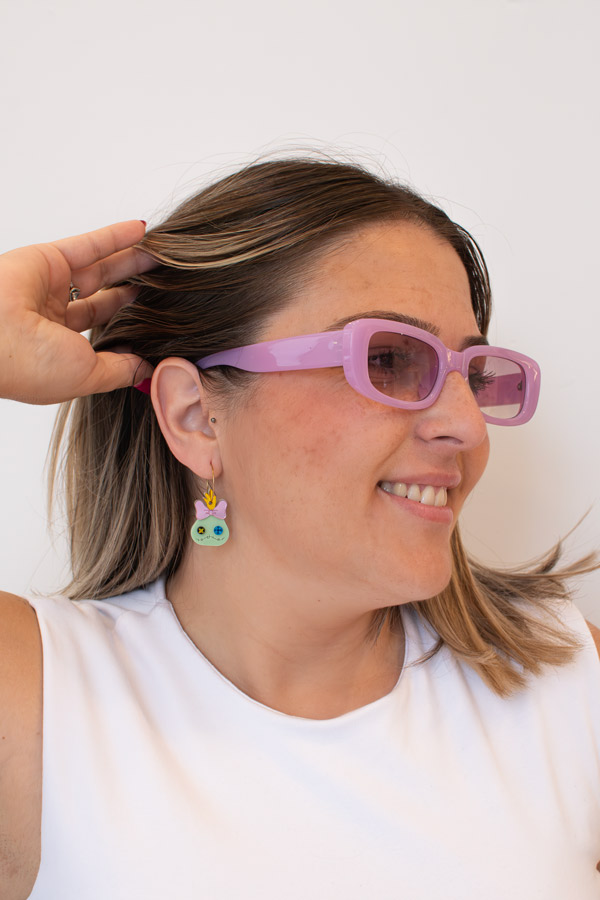 Este par presenta la icónica cara de Scrump, cuidadosamente elaborada a mano en metacrilato de efecto pastel verde, con detalles vibrantes en metacrilato efecto espejo en tonos dorado, rosa y azul. El aro en contacto con la oreja es de acero inoxidable hipoalergénico, garantizando comodidad y resistencia. Perfectos para fans de la película y amantes de la joyería artesanal, estos pendientes añaden un toque divertido y original a tu estilo
