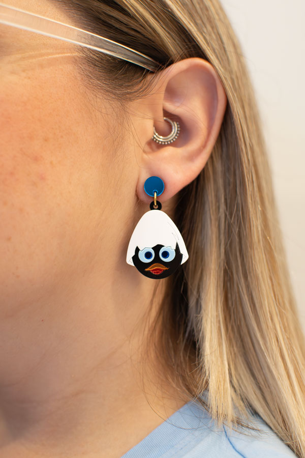 Este par presenta el rostro de Calimero, cuidadosamente elaborado a mano en metacrilato blanco, negro y azul, con destellos en efecto espejo azul, naranja y rojo que aportan un brillo vibrante y lleno de vida. El perno en contacto con la oreja es de acero inoxidable hipoalergénico, garantizando comodidad y durabilidad para el uso diario. Estos pendientes son ideales para fans de los dibujos animados clásicos y amantes de la joyería artesanal que buscan un toque de nostalgia y dulzura.